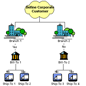 The diagram below shows a hierarchy setup with a variety of inherited triggers, from the corporate customer to several bill-to and ship-to branches. "Yes" represents an entity set to inherit triggers, and "No" represent an entity set not to inherit triggers.