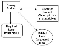 Products can have defined relationships within the system. These relationships help sales personnel and purchasing agents so that they do not have to keep a separate list for items that can be substituted for one another. In addition, the system helps them with items which are associated to other products and either require that they be purchase or are recommended to be purchased with the parent product.