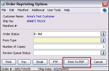 On the Order Reprinting Options window, if the user has the Print to PDF setting selected a Print to PDF button displays as an option. If the user is set to Print to PDF, but the document that they want to print is disabled, the Print to PDF button does not display.