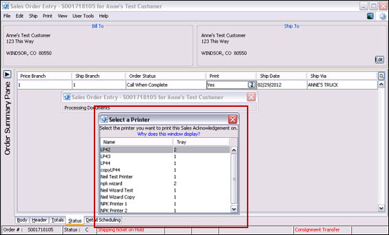 From the Status tab of an order while processing an order, if the user's terminal ID is set to Print to PDF, the user's document displays in the PDF viewer, such as Adobe Acrobat©. From there, users can select any printer defined for their computer. If a user has the Print to PDF setting and the document they want to print is disabled, a prompt displays to select a printer.