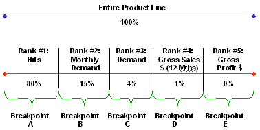 The following percentages reflect the normal industry convention for ranking breakpoints called the 80/20 rule. This rule says that 20 percent of your products accounts for 80 percent of your sales: