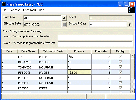 On the Price Sheet Entry window dated 07/01/02, set up the formulas and basis codes as shown, and described below.