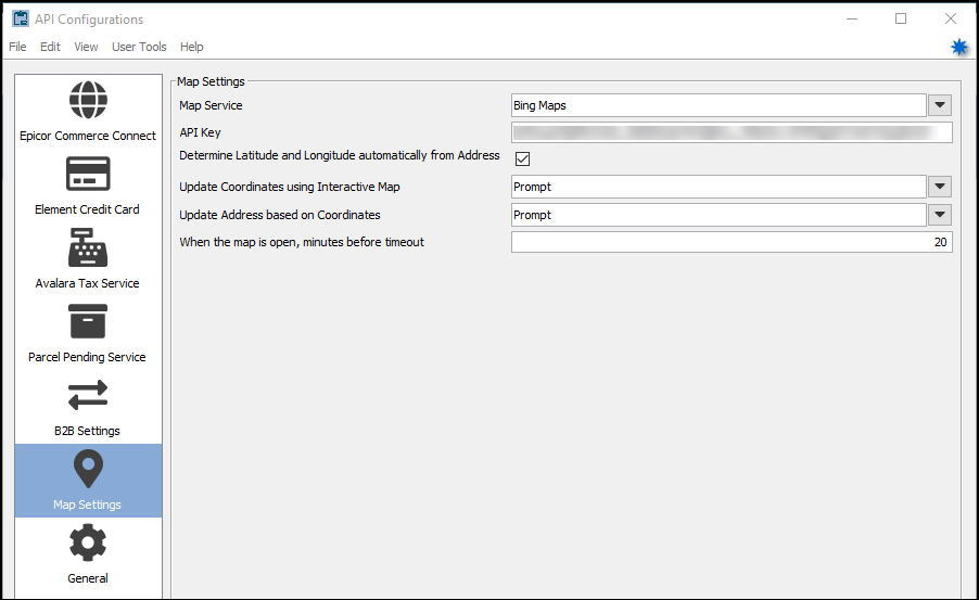 To use the latitude and longitude for addresses in Eclipse, set up the Map Settings in the API Configuration window. The default is that no map service is selected and the feature is not active.