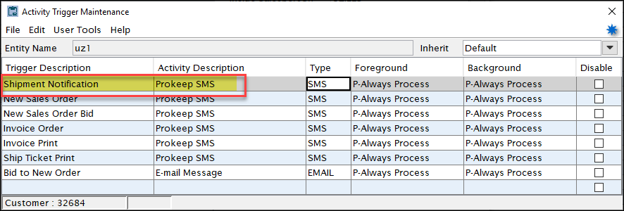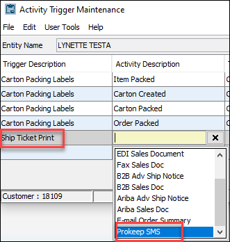 With the trigger enabled in your Eclipse system, you determine which trigger activities you want to generate a text message to your customer. Set up the trigger as normal for a customer or a vendor on the maintenance window and the Activity Trigger Maintenance option. Now you have the Prokeep SMS option on the Activity Description list.